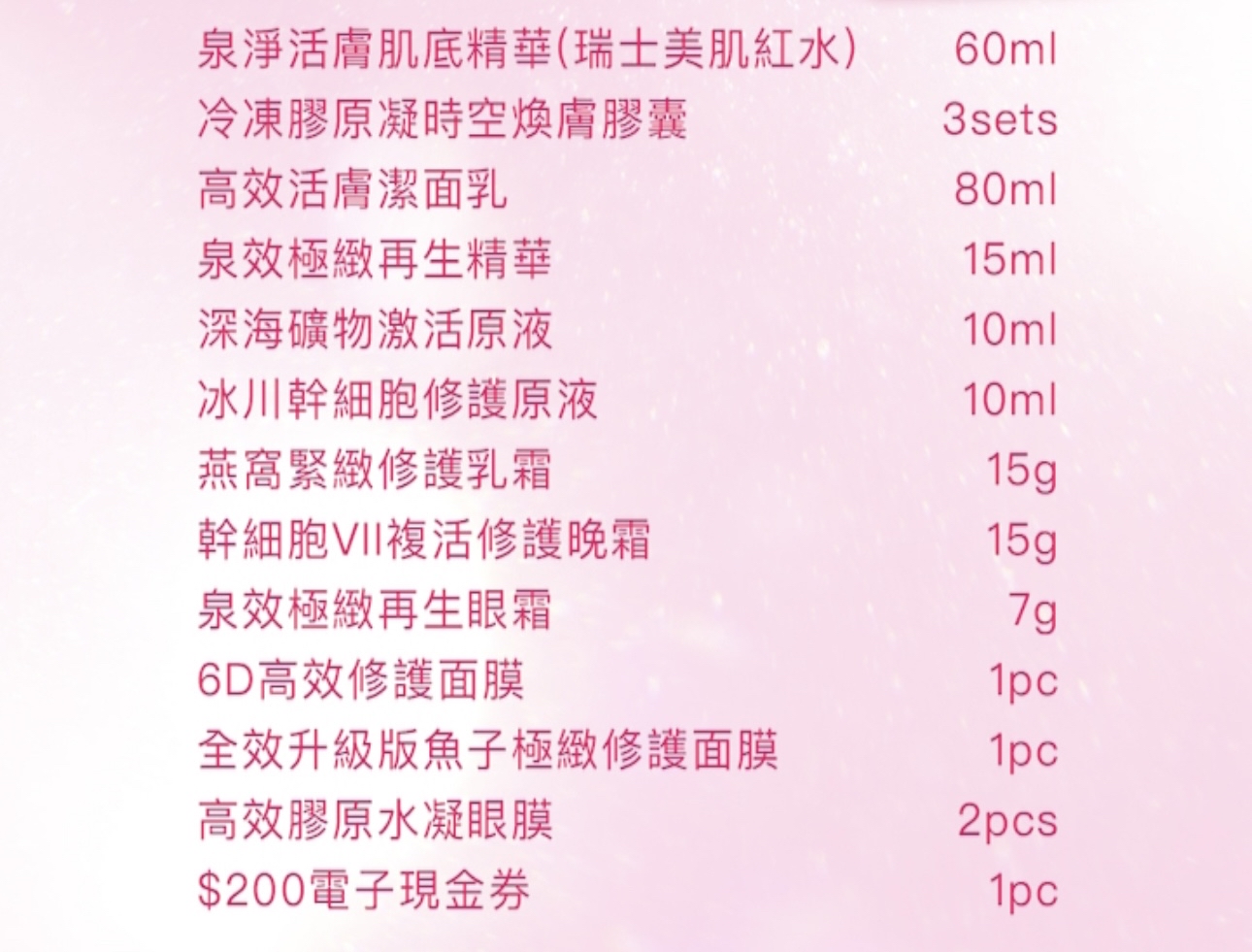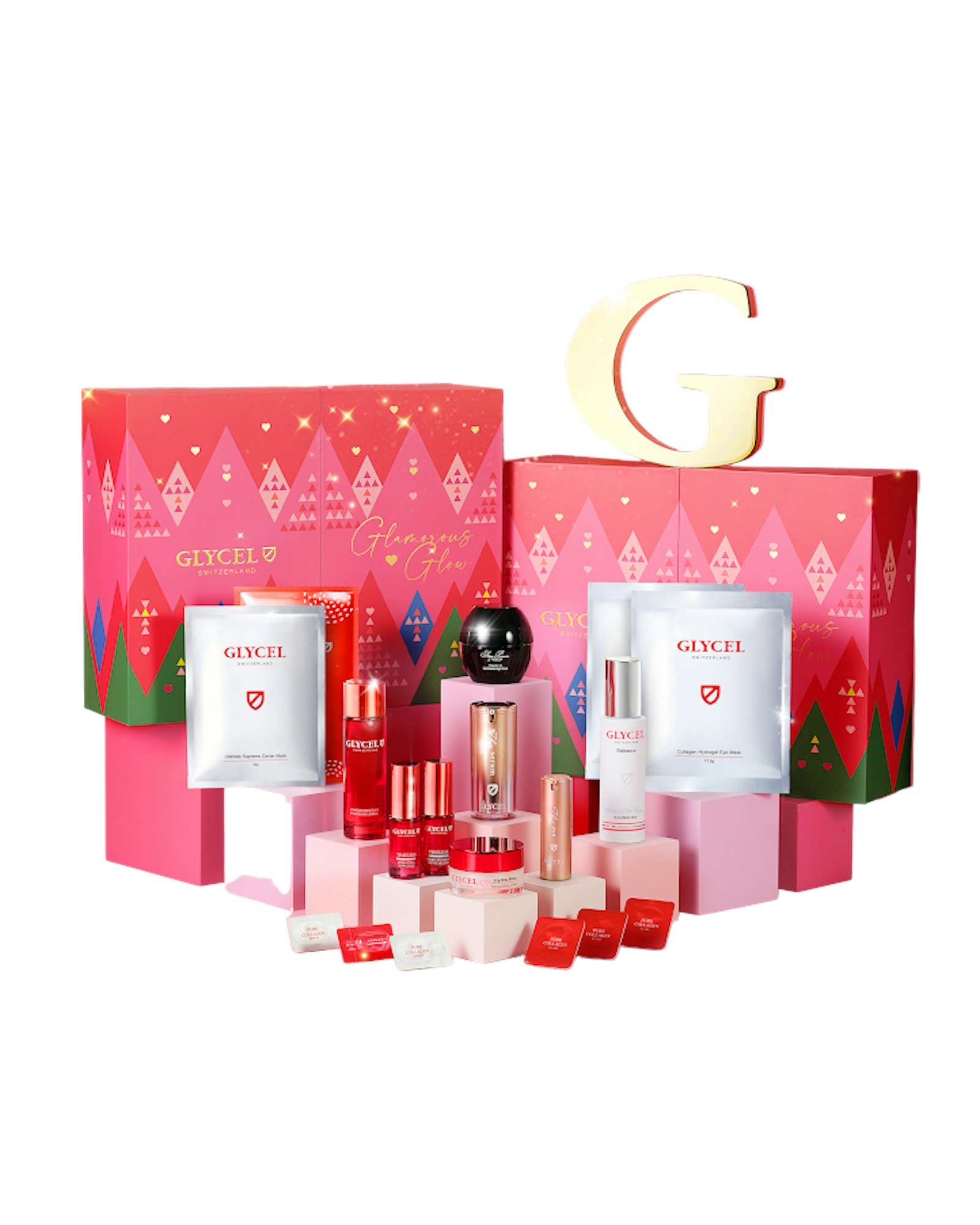 瑞士肌膚細胞再生專家 GLYCEL 今年聖誕推出的「瑞士聖誕鑽肌盛禮」,將奢華護膚體驗融入節日氣氛之中。套裝挑選多款品牌經典產品,於佳節中寵幸自己,以最佳肌膚狀態出席盛會! 套裝內包含 15 件 GLYCEL 暢銷產品,覆蓋由潔膚、修護至深層滋養,包括瑞士美肌紅水、冷凍膠原凝時空煥膚膠囊、修護面霜,以及多款高效面膜,全面照顧不同肌膚需要。 第一步: 啟動肌膚能量 泉淨活膚肌底精華(瑞士美肌紅水)60ml 冷凍膠原凝時空煥膚膠囊 3 sets 高效活膚潔面乳 80ml 泉效極緻再生精華 15ml 第二步: 綻放護膚力量 深海礦物激活原液 10ml 冰川幹細胞修護原液 10ml 泉效極緻再生眼霜 7g 燕窩緊緻修護乳霜 15g 第三步: 修護綻放肌膚 幹細胞 VII 複活修護晚霜 15g 6D 高效修護面膜 1片 全效升級版魚子極緻修護面膜 1片 高效膠原水凝眼膜 2片 * 禮盒含$200電子現金券